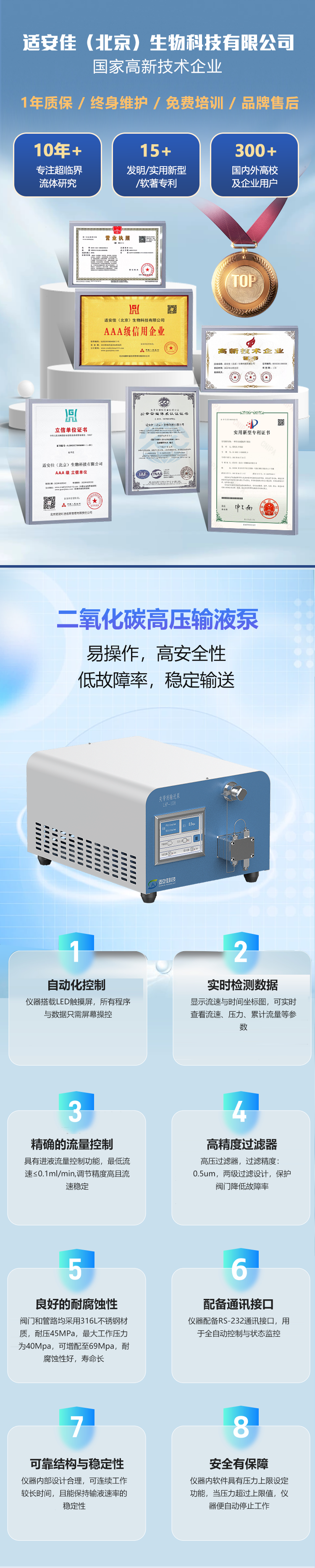 {"樣品池":"316L不銹鋼材質,帶藍寶石視窗和照明","氣路控制":"耐高壓閥門和管路,精確的流量控制,排氣流速≤10ml/min。","溫度控制":"電加熱和內置壓縮機制冷,自動溫控,精度:±1℃。","過濾系統":"內置和外置0.5um精度高壓過濾器。","耐高壓管路":"316L不銹鋼材質,精確設計,耐腐蝕和高壓。","臺式CO2高壓泵":"316L不銹鋼泵頭,藍寶石活塞,流速:0-100ml/min,壓力0 40Mpa ,內置預冷罐為壓縮機制冷,無需冷水機。恒流恒壓模 式可選,觸摸屏操作,壓力